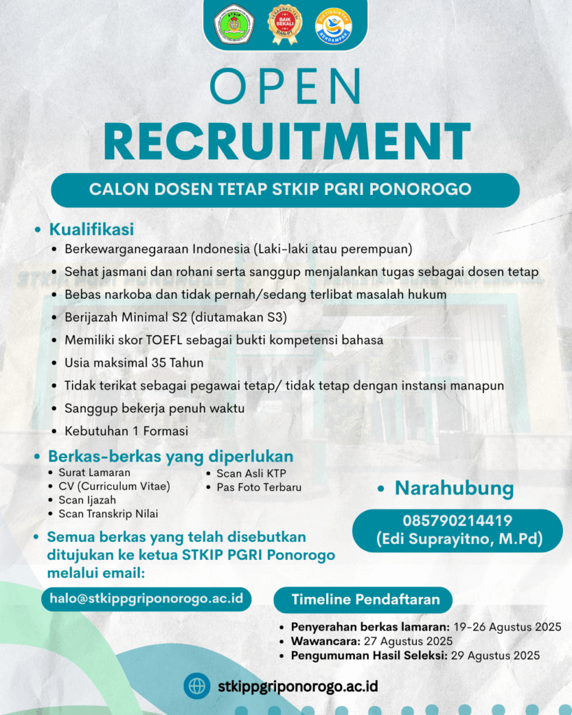 STKIP PGRI Ponorogo membuka lowongan calon dosen tetap. Berikut kami sampaikan kualifikasi dan persyaratan lainnya.