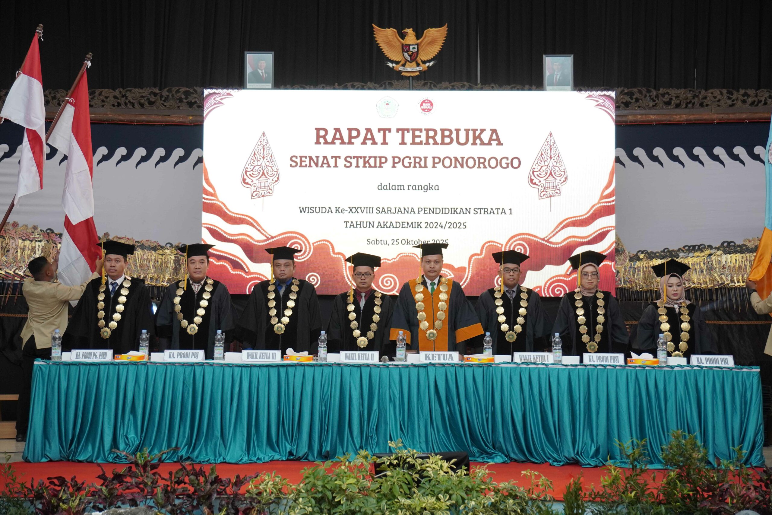 STKIP PGRI Ponorogo kembali menggelar Rapat Terbuka Senat STKIP PGRI Ponorogo dalam rangka Wisuda Ke-XVIII Sarjana Pendidikan Strata I Tahun Akademik 2024/2025, Sabtu (25/10/2025). Acara kelulusan mahasiswa yang telah menyelesaikan ini sebanyak 162 wisudawan. Empat di antaranya dinyatakan sebagai wisudawan terbaik dengan predikat Cumlaude.