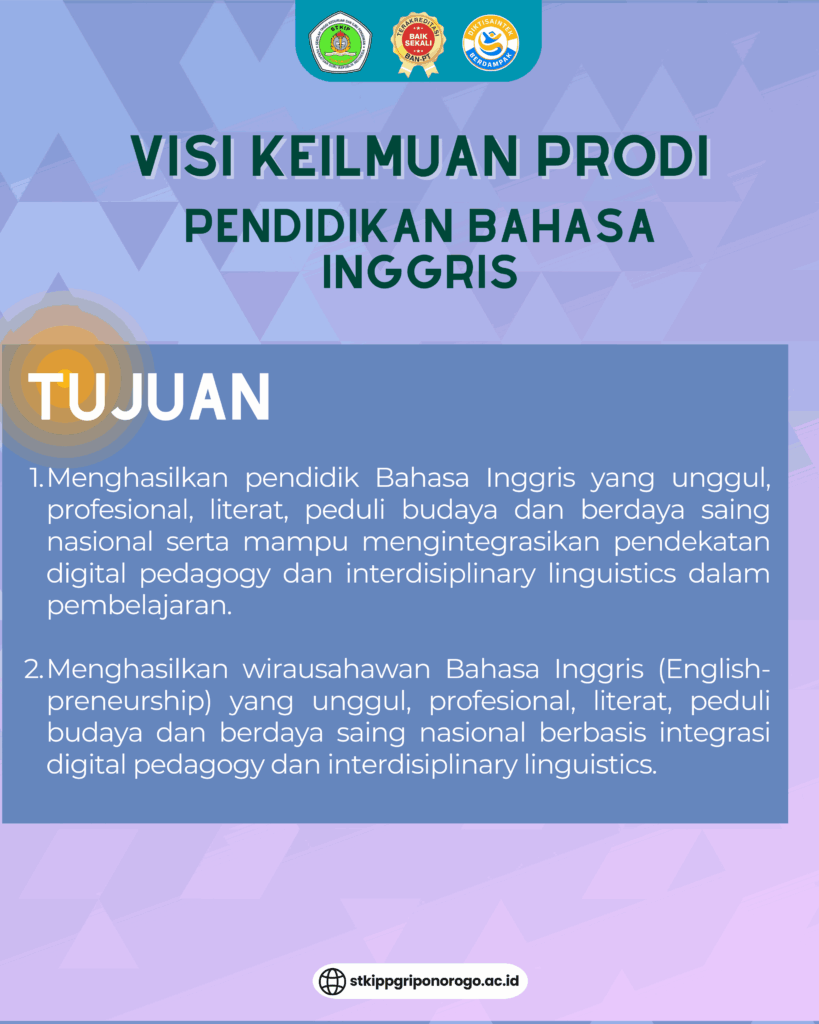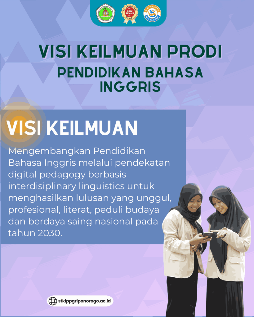 Visi Keilmuan Prodi PBI By admin stkip Info PBI,Kabar Kampus Literasi, No Comment 27Nov, 2025 Share Jumlah Pengunjung: 11 Untuk memperluas pemahaman tentang Program Studi Pendidikan Bahasa Inggris (PBI) STKIP PGRI Ponorogo, berikut merupakan visi keilmuan dan tujuan. Previous Orientasi Jurusan dan Temu Akrab Himpunan Mahasiswa (HIMA) Diwangkara November 24, 2025 No comment yet! You will be the first to comment. Add Comment: Cancel ReplyAlamat email Anda tidak akan dipublikasikan. Ruas yang wajib ditandai * Δ Situs ini menggunakan Akismet untuk mengurangi spam. Pelajari bagaimana data komentar Anda diproses