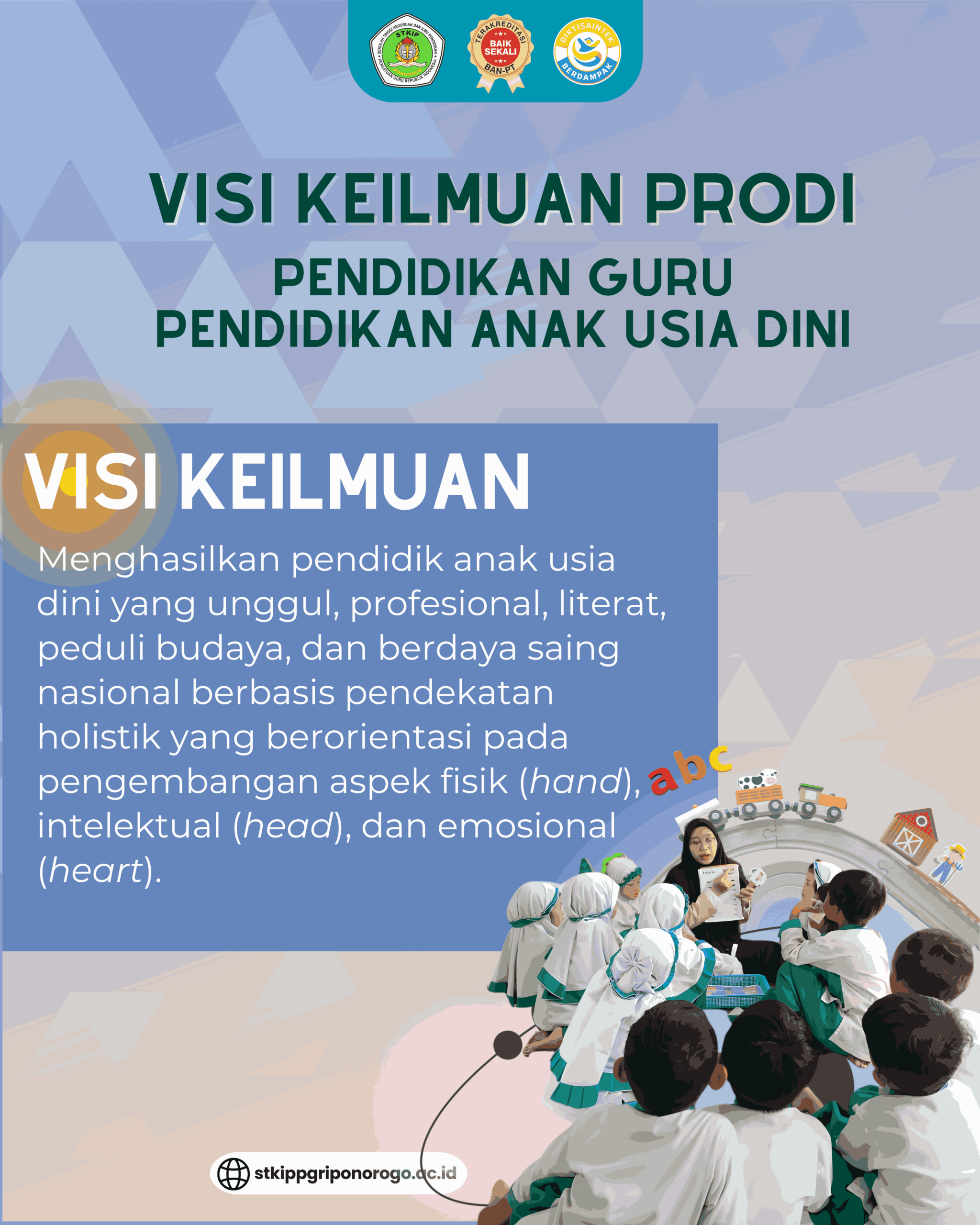 Visi Keilmuan Prodi PG-PAUD By admin stkip Berita Media,Kabar Kampus Literasi, No Comment 20Nov, 2025 Share Jumlah Pengunjung: 9 Untuk memperluas pemahaman tentang Program Studi Pendidikan Guru Pendidikan Anak Usia Dini (PG-PAUD) STKIP PGRI Ponorogo, berikut merupakan visi keilmuan dan tujuan. VISI Keilmuan PG-PAUDUnduh Previous Visi Keilmuan Prodi PBSI November 19, 2025 No comment yet! You will be the first to comment. Add Comment: Cancel ReplyAlamat email Anda tidak akan dipublikasikan. Ruas yang wajib ditandai * Δ Situs ini menggunakan Akismet untuk mengurangi spam. Pelajari bagaimana data komentar Anda diproses